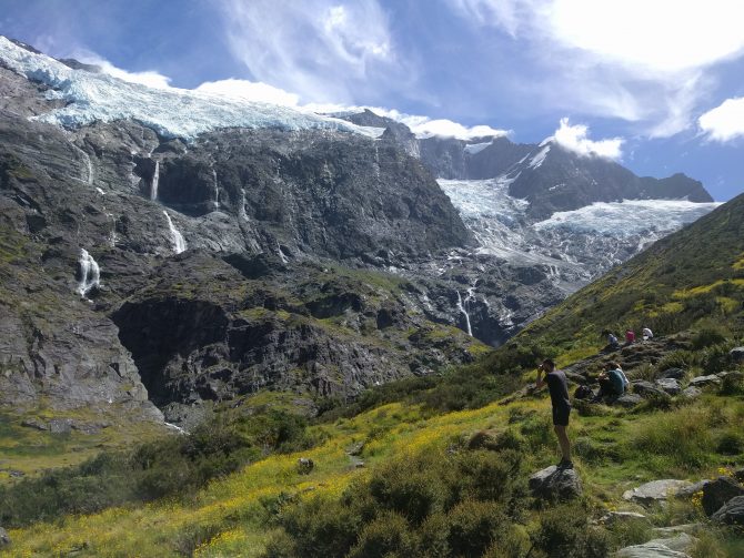 I enjoy the hike with another person for a change. I would not mind being on my own as always, but the company is comforting, a reprieve from the discomfort I have felt the last few days. The walk is not hard and we chat for the two hours it takes us to get to the lookout point for the glacier. The sun shines off the blue and white ice brilliantly, a natural gem sitting on top of the mountains. We spend an easy time sitting on the grass eating lunch in the sun while enjoying the view.