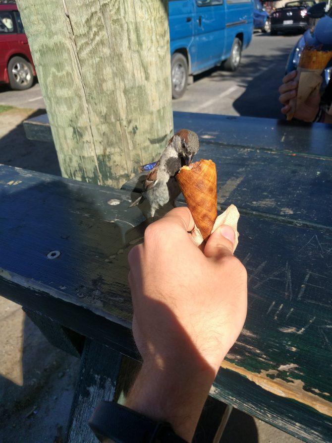 Back in Wanaka, we sit on the lakeside with our ice cream cones. It is the first time I have seen American sized portions here, the two scoop cone in my hand is ridiculously large. The air is warm and the sky is clear. The lake glistens in the sun. Birds stick close by to us as they tend to in spots where people bring food. I let one pick at my cone once I have finished most of it.